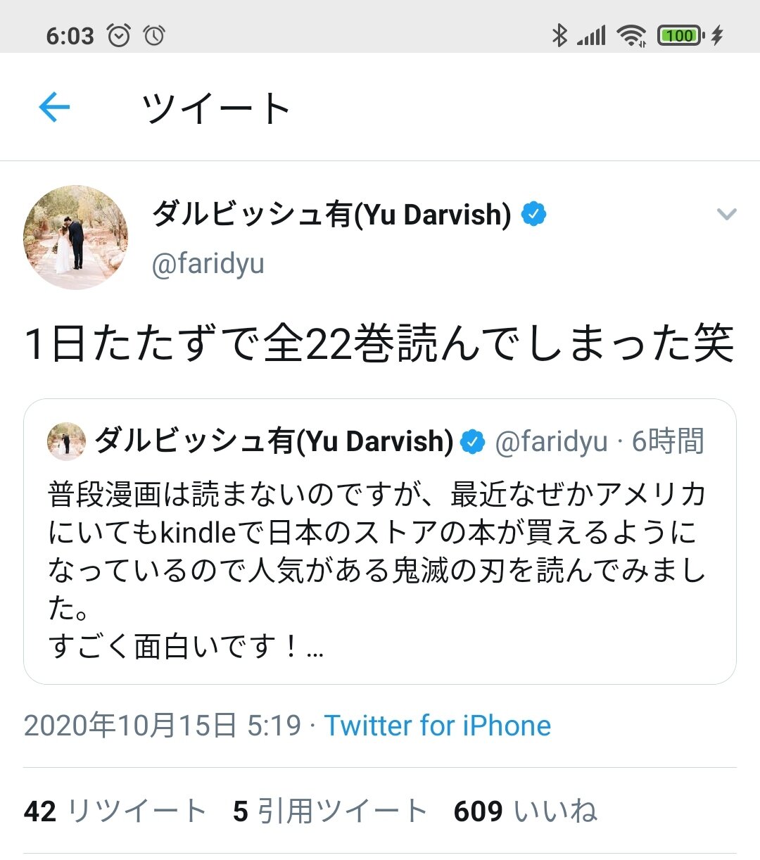 ダルビッシュ、鬼滅にはまってしまう 1日で読破