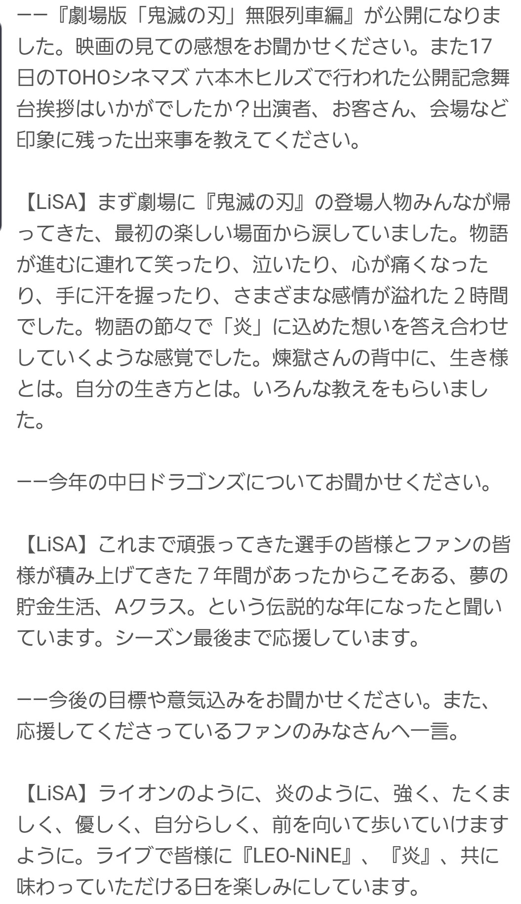 LiSAさん「今年の中日ドラゴンズは夢のAクラス。伝説的な年になった」