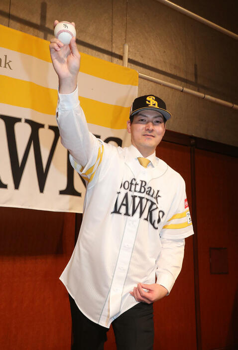 黒のスーツに、球団カラーを意識したゴールドのネクタイを締めて登場。「本当に、福岡ソフトバンクホークスに入団することができてうれしく思っています。この2年間、(メジャーで)先発として(成績の)数はこなせてなかったけど、その中で高い評価をしていただいて、強いチームで一緒にやろうと言っていただいた。この『チームでやってみたい』と思ったのが一番のきっかけです」と決断理由を明かした。