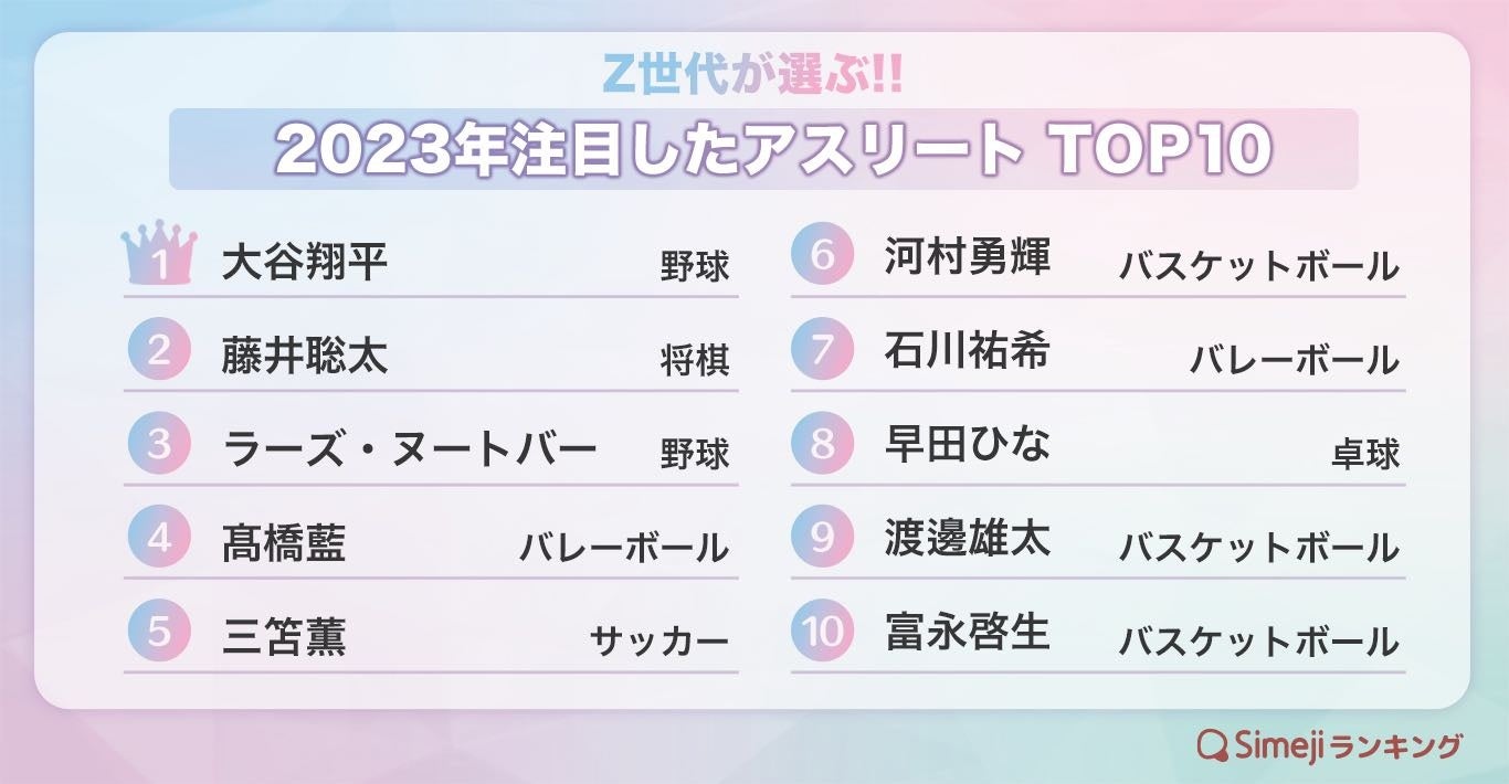 Z世代が選ぶ!!「2023年注目したアスリートTOP10」1位大谷翔平 2位藤井聡太 3位ヌートバー 4位髙橋藍 5位三笘薫