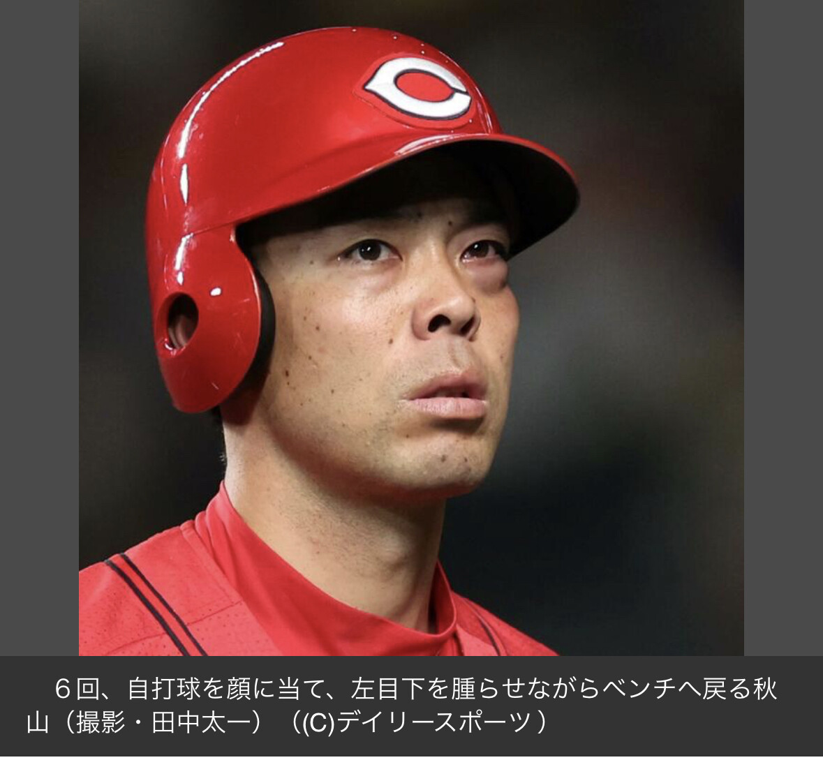 広島・秋山、顔面に自打球で途中交代 左目下が腫れる