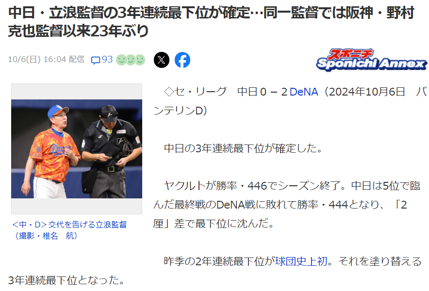 スポニチさん、立浪ドラゴンズ3年連続最下位をフライング配信してしまうwwwwww