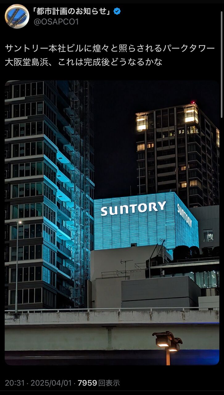 【悲報】大阪堂島で建設中のマンション、サントリー本社に煌々と照らされてしまう…