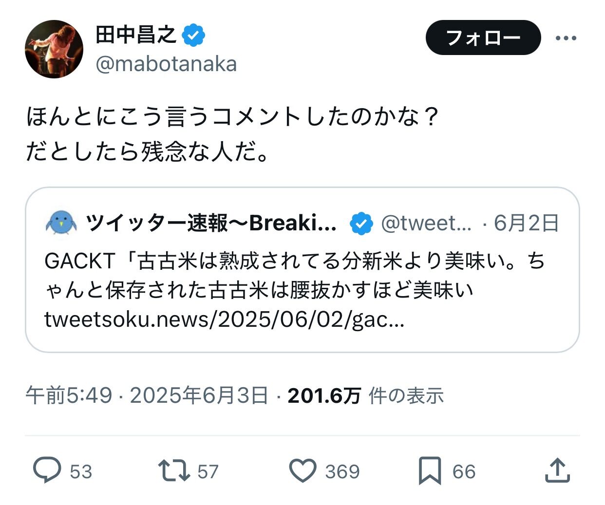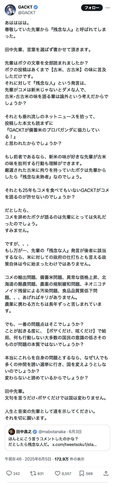 【画像】GACKTさん、古古米を美味いと言ったところ業界の先輩に苦言を呈され超長文で反論