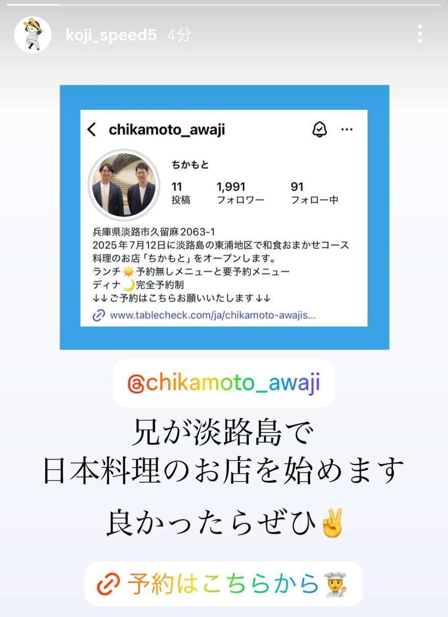 近本のお兄さん、淡路島に和食店「ちかもと」を開業