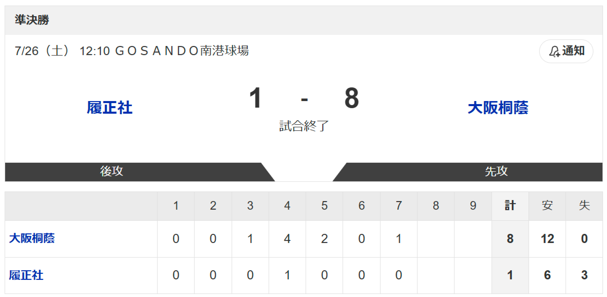 大阪大会は26日に準決勝2試合が行われ、大阪桐蔭は履正社を8―1の7回コールドで制して決勝進出を決めた。