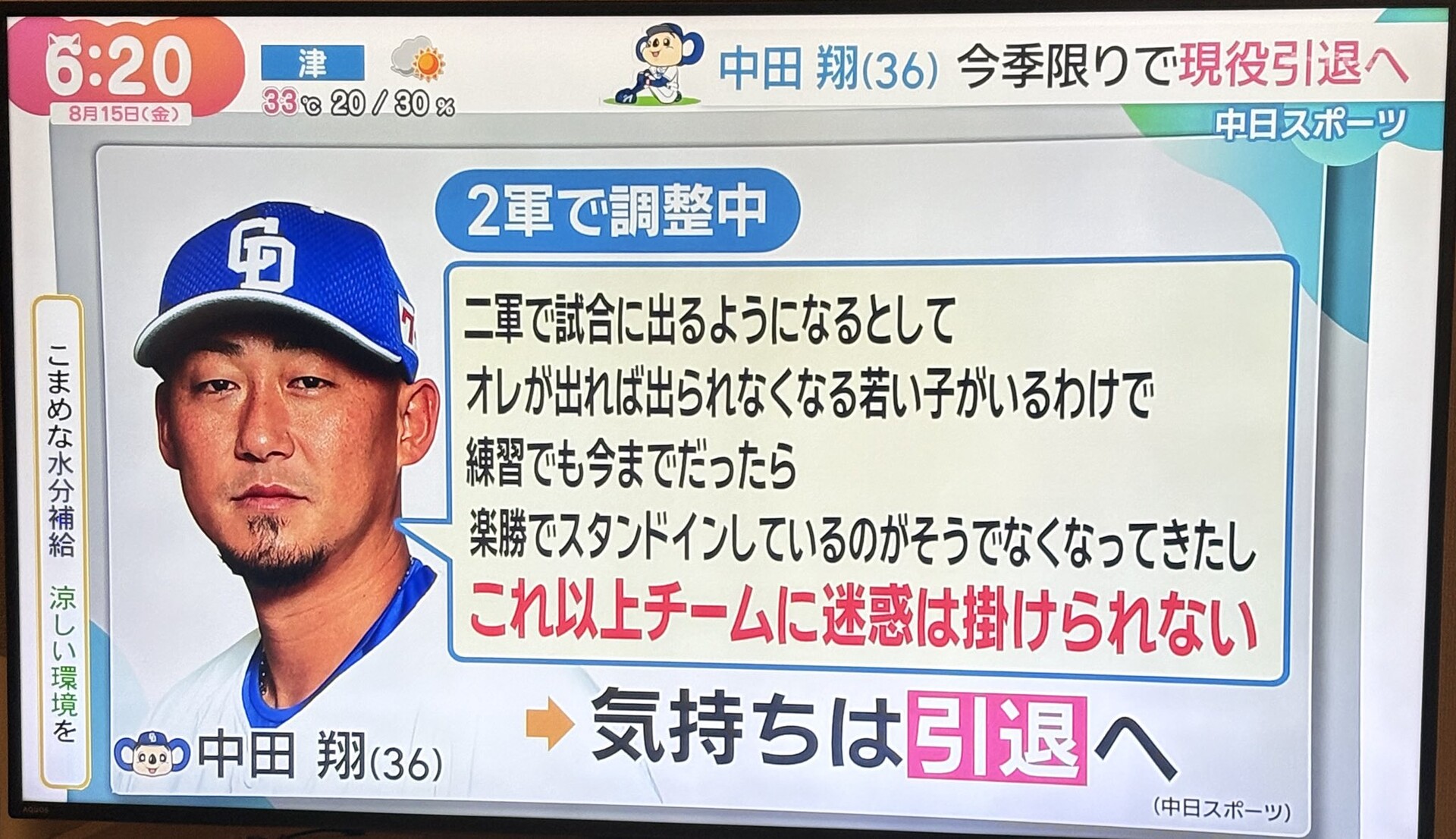 中田翔(36)「自分が試合に出ると若手のチャンスがなくなる」「衰えで迷惑はかけられない」