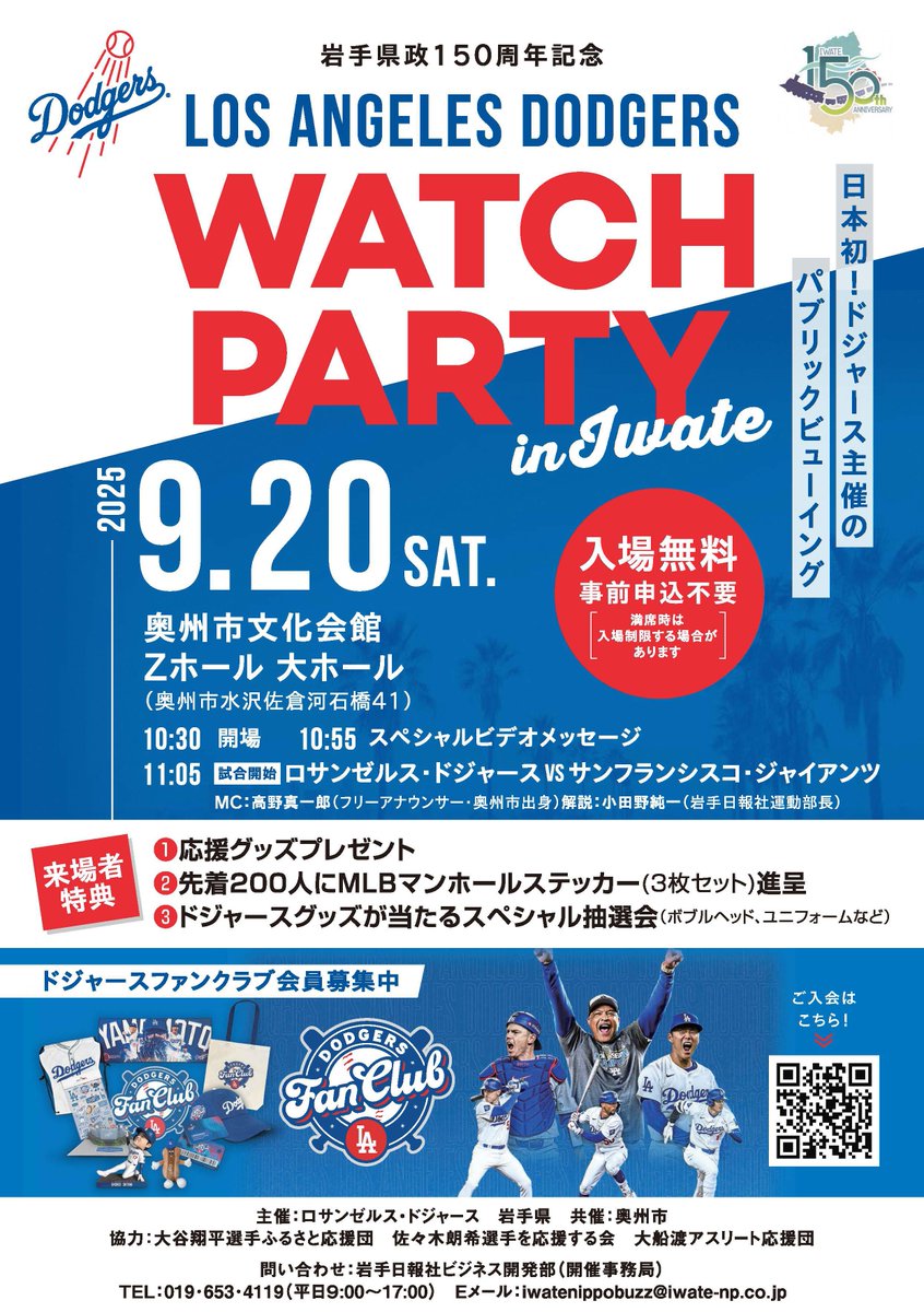 岩手県政150周年を記念して、“日本初”ドジャース主催のパブリックビューイングを開催