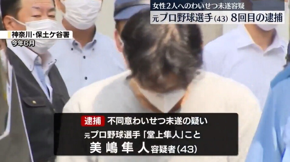 【速報】元プロ野球選手(43)を20代女性2人へのわいせつ未遂容疑で8回目の逮捕…これまでの被害者は10代・20代の女性11人に 福岡ソフトバンクホークスで「堂上隼人」の名前でプレー 神奈川県警神奈川県横浜市の路上で、面識のない20代の女性2人にわいせつな行為をしようとしたとして、元プロ野球選手の男が再逮捕されたことがわかりました。これで8回目の逮捕で、これまでに11人の女性が被害にあったとみられています。