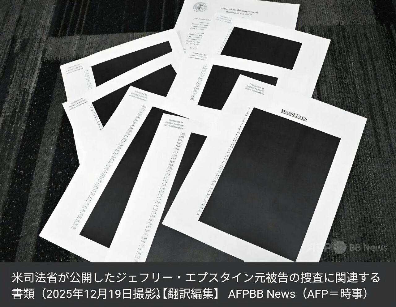 【AFP=時事】少女らへの性的人身取引の罪で起訴され、勾留中に自殺した富豪ジェフリー・エプスタイン元被告に関する一部記録が19日に公開された。しかし、多くのページが黒塗りされ、写真も検閲されているとして、不満や怒りの声が上がっている。