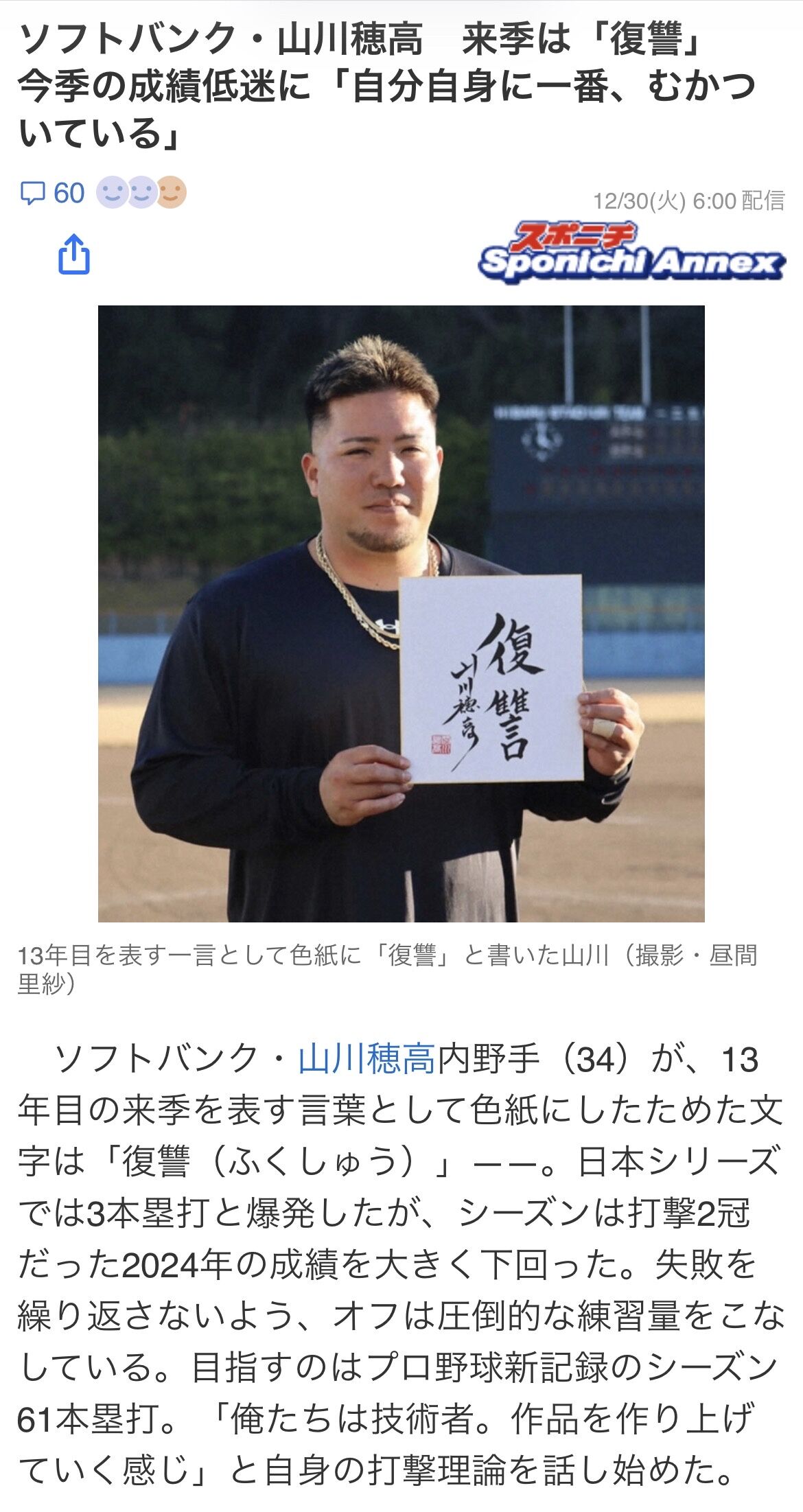 山川は12年目の今季を、日本シリーズ以外いいところがなかったと振り返る。シーズン打率・226、23本塁打の成績に納得しておらず、来季を表す言葉に「復讐」を挙げた。