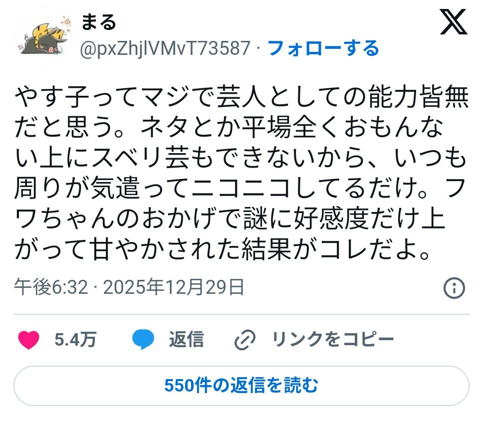 【悲報】やす子、マジで嫌われ始める。Xのやす子嫌いツイートが5.5万いいね