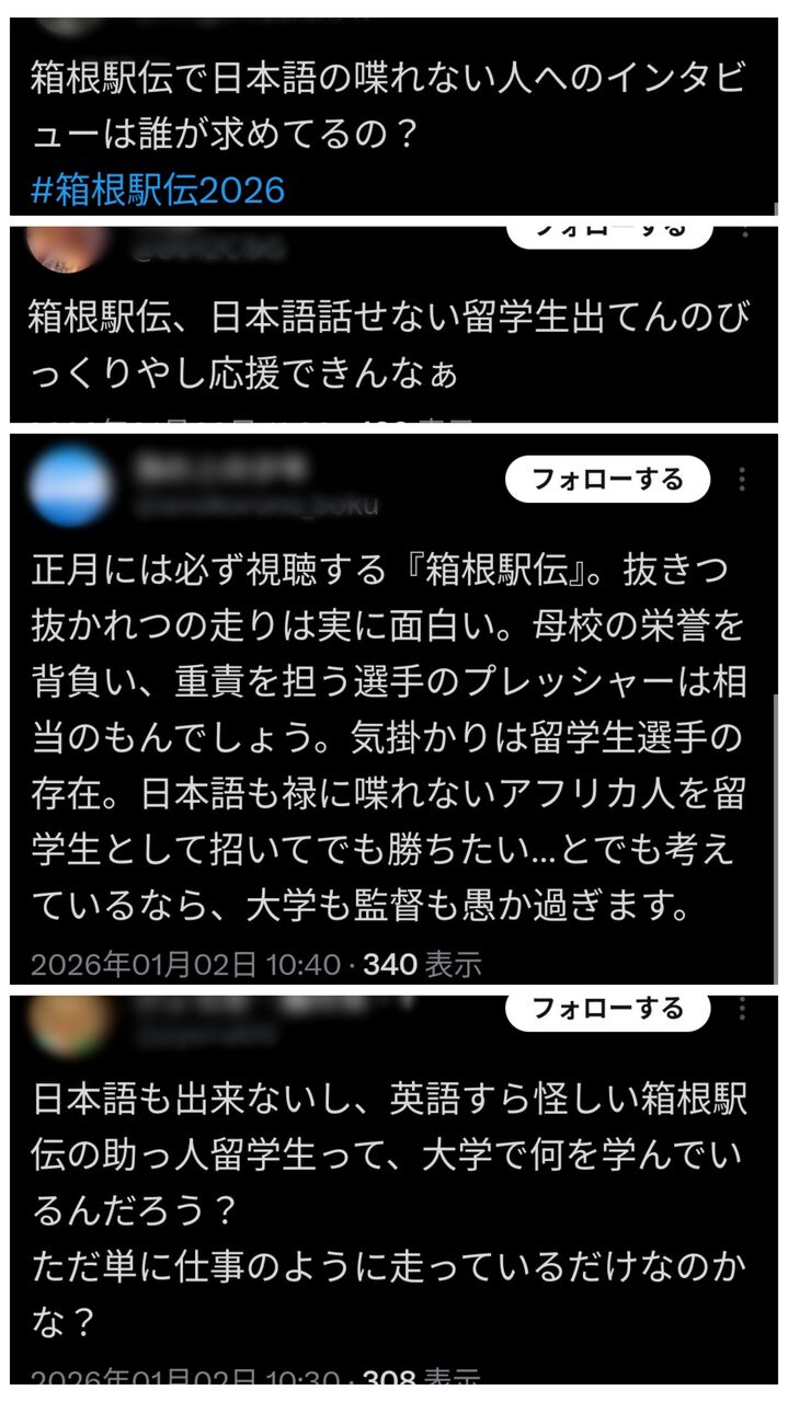 【画像】日本人、箱根駅伝の黒人選手にブチギレ「日本語も話せないって大学で何学んでるの?」
