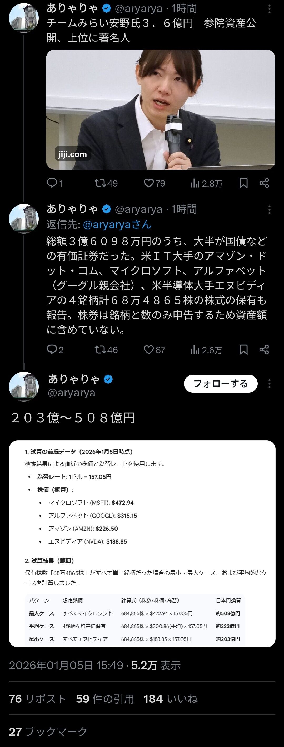 計68万4865株を4銘柄で均等に持っていると仮定・・・安野貴博の資産約325億円