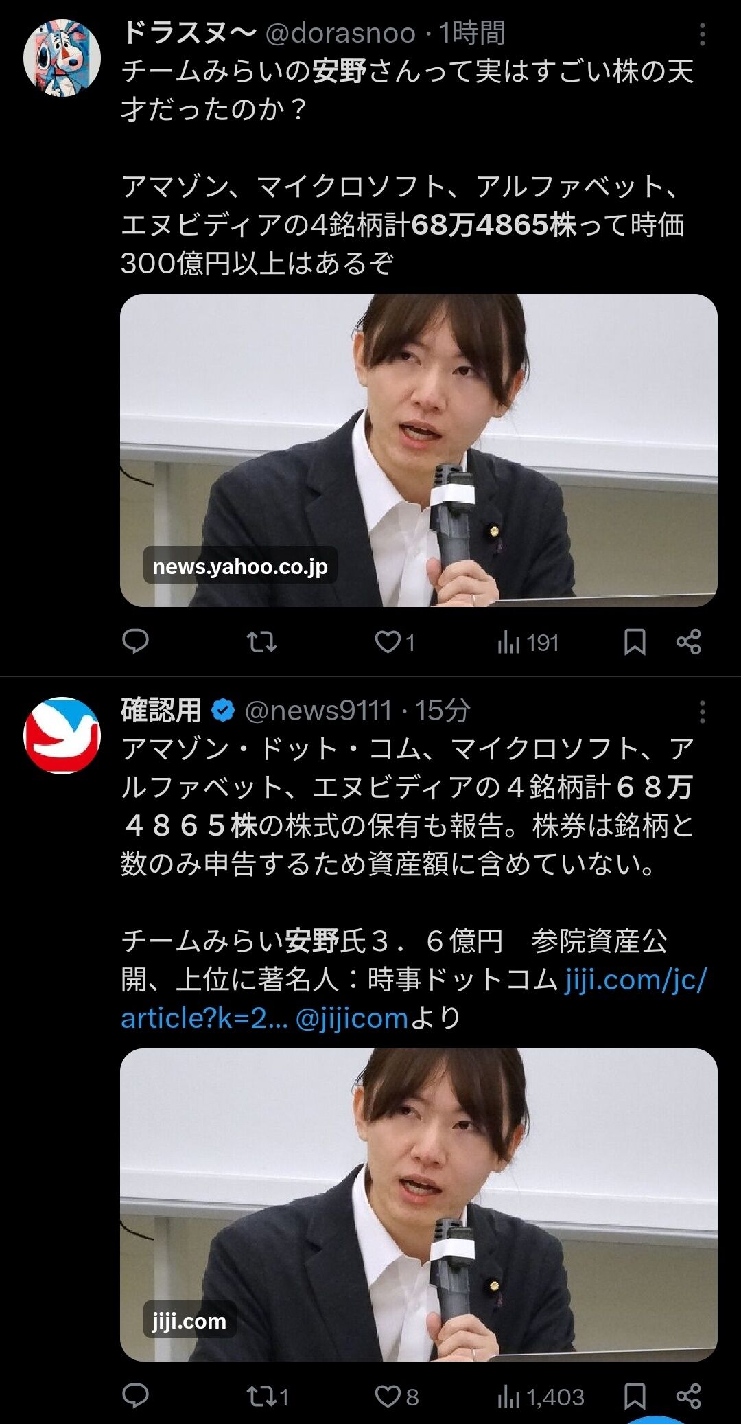 安野氏は人工知能(AI)関連企業の創業者。総額3億6098万円のうち、大半が国債などの有価証券だった。米IT大手のアマゾン・ドット・コム、マイクロソフト、アルファベット(グーグル親会社)、米半導体大手エヌビディアの4銘柄計68万4865株の株式の保有も報告。株券は銘柄と数のみ申告するため資産額に含めていない。