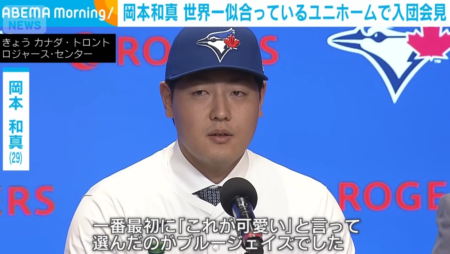 岡本和真、英語で会見「全力を尽くします」 ブ軍入り決め手は娘の“一言”「かわいい」複数球団の争奪戦の中でブルージェイズを選んだ理由は「凄く街がいいところで、何より強く、世界一になれるチームだと思います」と語った。また、入団の決め手について聞かれると、「僕の娘に30球団のロゴを見せたときに、一番最初に『これがかわいい』と言って選んだのがブルージェイズでした」とにこやかに話した。