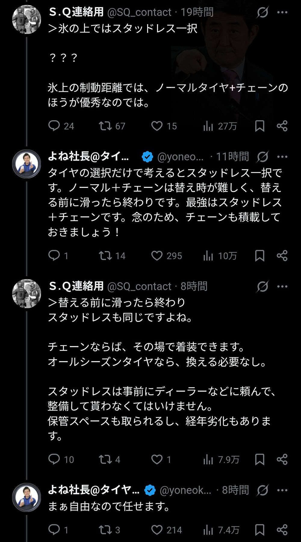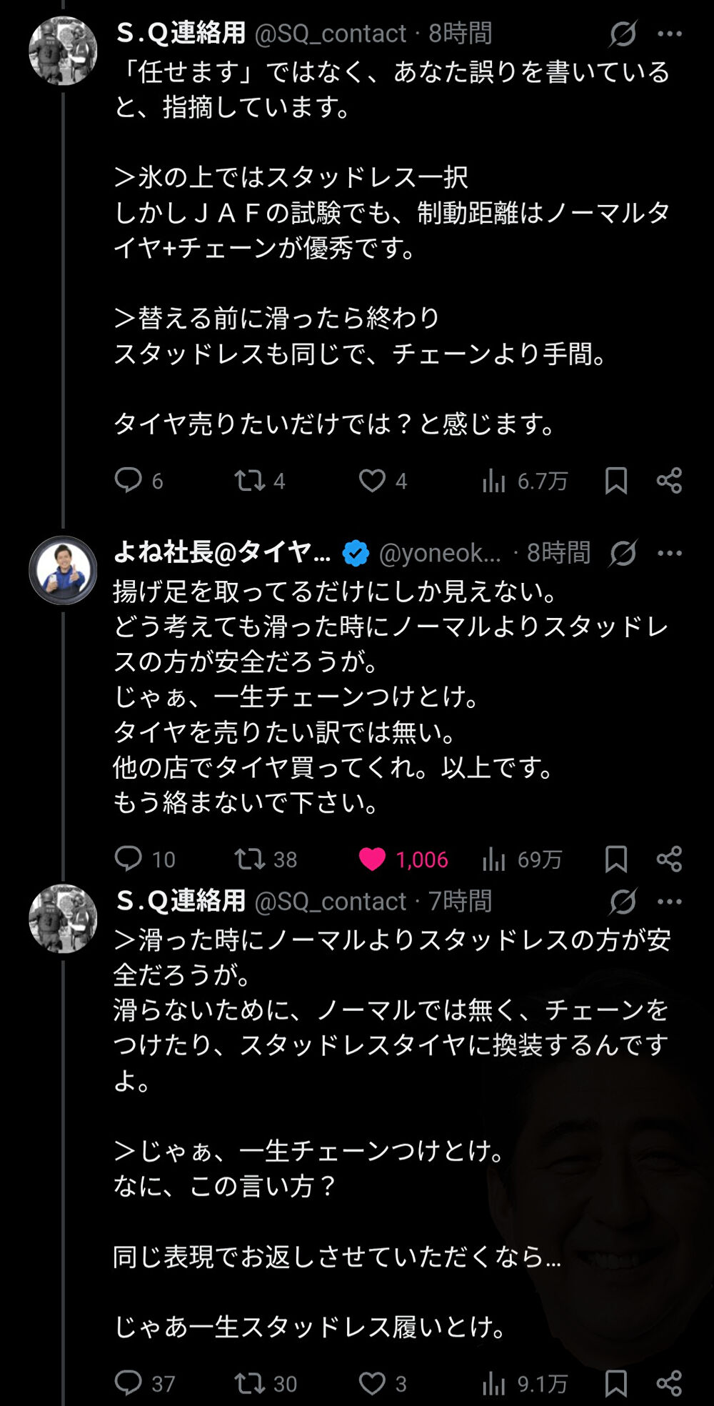 タイヤ屋社長「氷の上ならスタッドレス一択」→そして、レスバへ