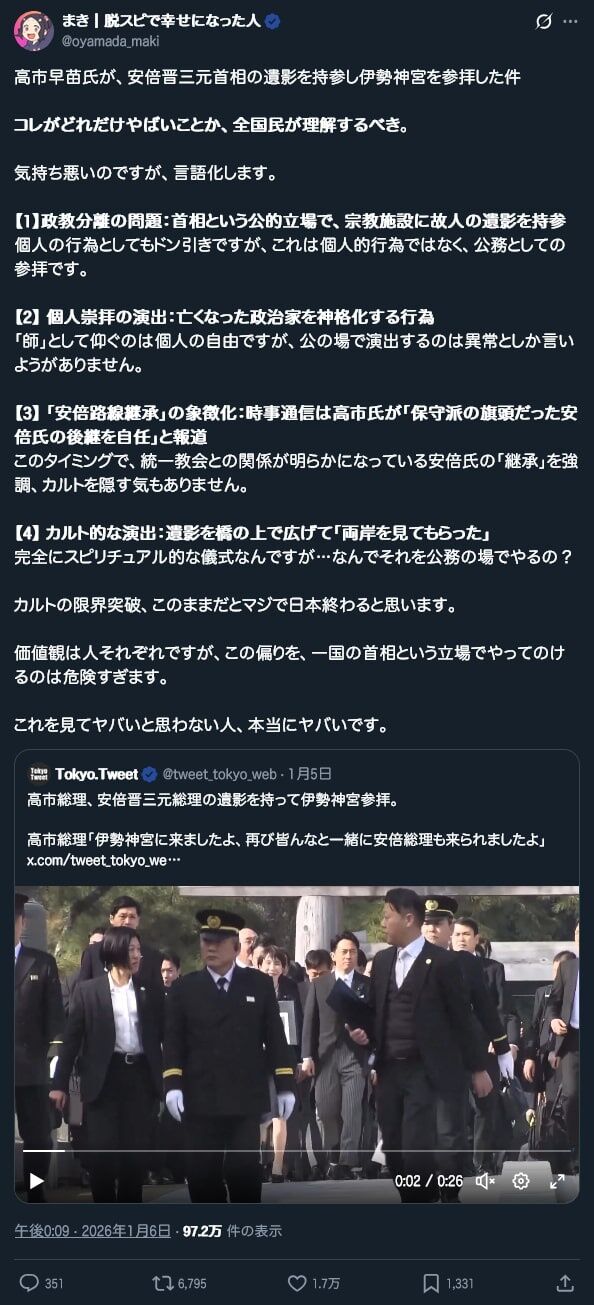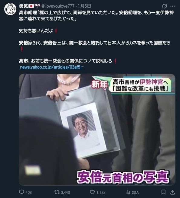 【悲報】高市早苗さん、安倍晋三の遺影をクリアファイルに入れて参拝 → Xで大炎上してしまう