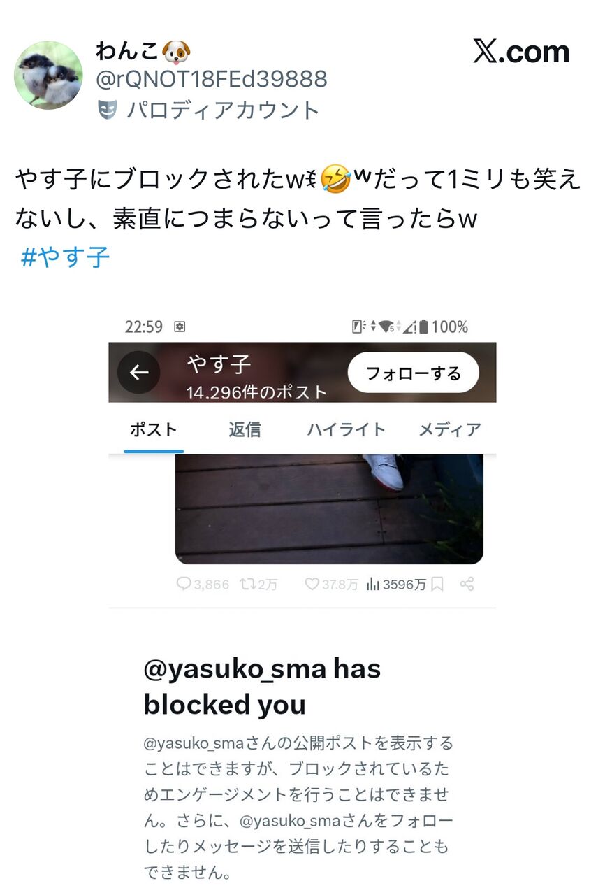 【悲報】芸人やす子、「つまらない」と言った一般人をブロックしてしまう