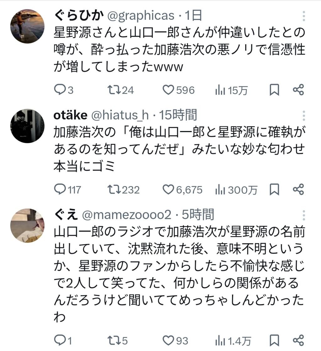 【悲報】加藤浩次、山口一郎と星野源の不仲を匂わせて炎上