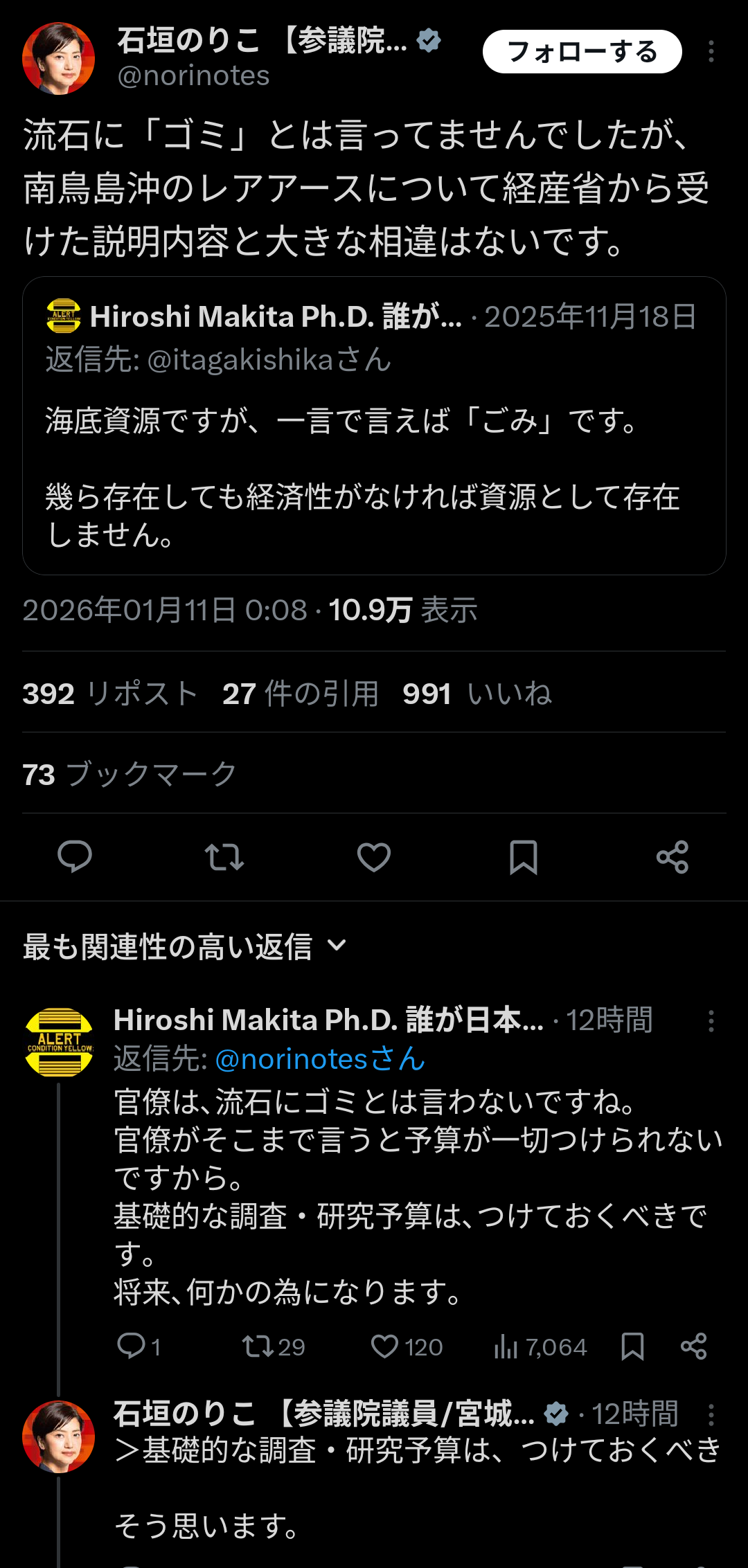石垣のりこ議員「経産省に問い合わせたら南鳥島沖のレアアースで採算取るのは無理だと…」→炎上