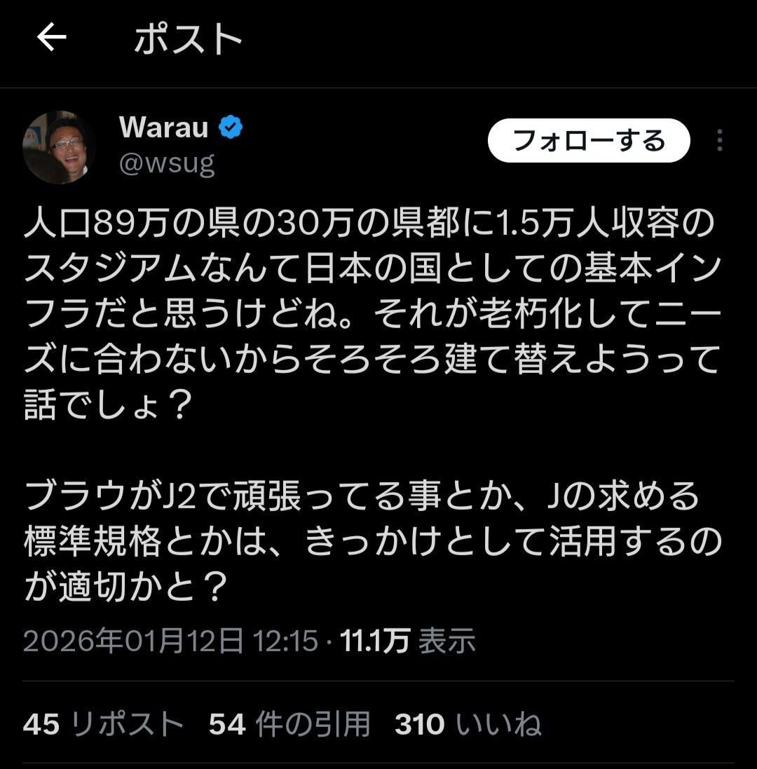 人口89万の県の30万の県都に1.5万人収容のスタジアムなんて日本の国としての基本インフラだと思うけどね。それが老朽化してニーズに合わないからそろそろ建て替えようって話でしょ?