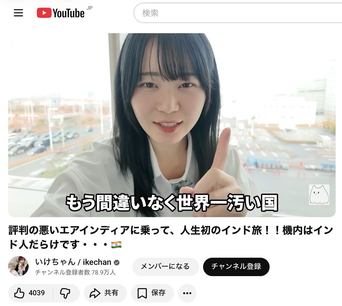 問題となったのは、1月17日に公開された「評判の悪いエアインディアに乗って、人生初のインド旅!!機内はインド人だらけです・・・」と題されたインドへの旅動画。
