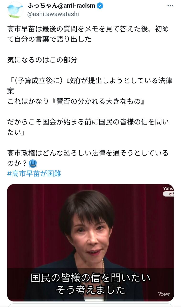 高市早苗「かなり賛否の分かれる法案を提出しようと思ってる。『出していいか』の賛否を国民に問いたい