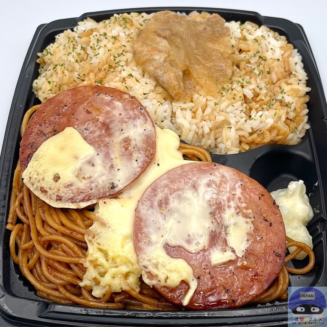 にんにく醤油だれがかかったご飯に、ソーセージステーキと生姜焼き、ソース味の焼きスパゲッティを組み合わせた、満足感のある大盛り弁当です。