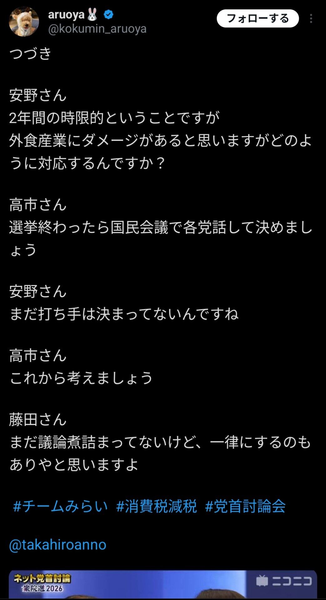 安野「2年間の時限的ということですが、外食産業にダメージがあると思いますがどのよ うに対応するんですか?」