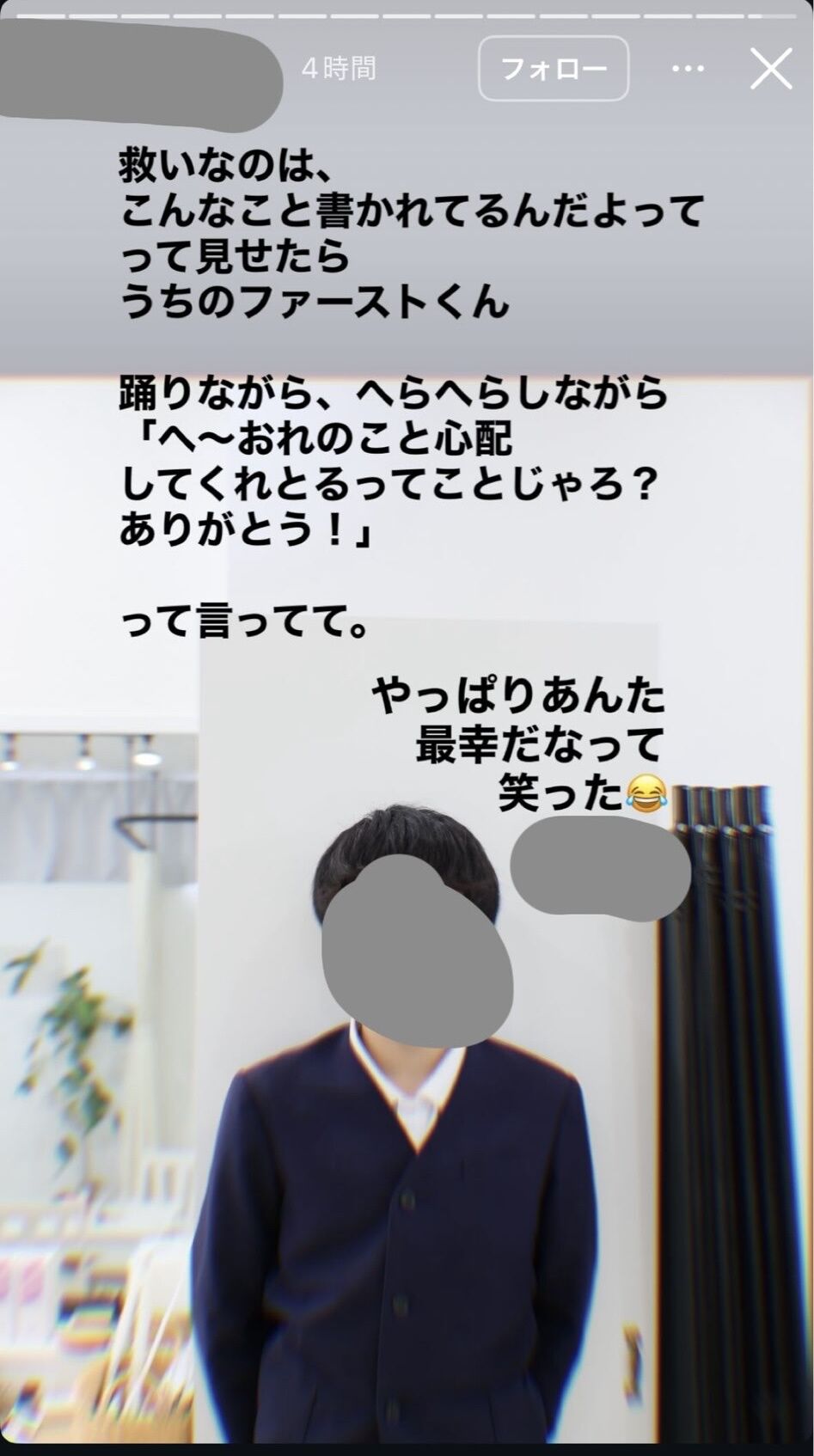 両親の帰宅後、せいやは長男を抱き上げ、「お前はまだ小学生や! まだ大人になんなよ」と真剣な表情で背中を叩き、長男も頷いた。なお、VTRの最後では、家族とお別れの挨拶をしたせいやが扉を閉めると、母親が長男に「米炊いて!7合!」と呼びかける声が響いていた。