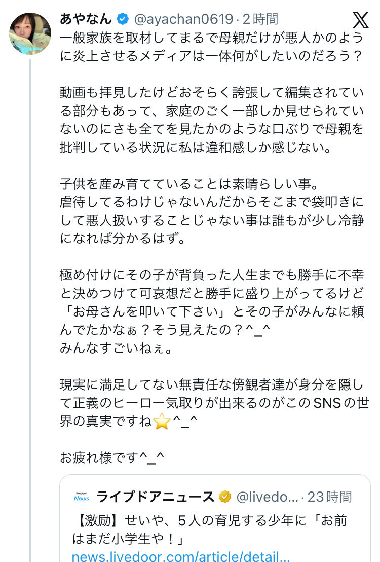 YouTuberあやなんさん、ナイトスクープで炎上した嫁を擁護