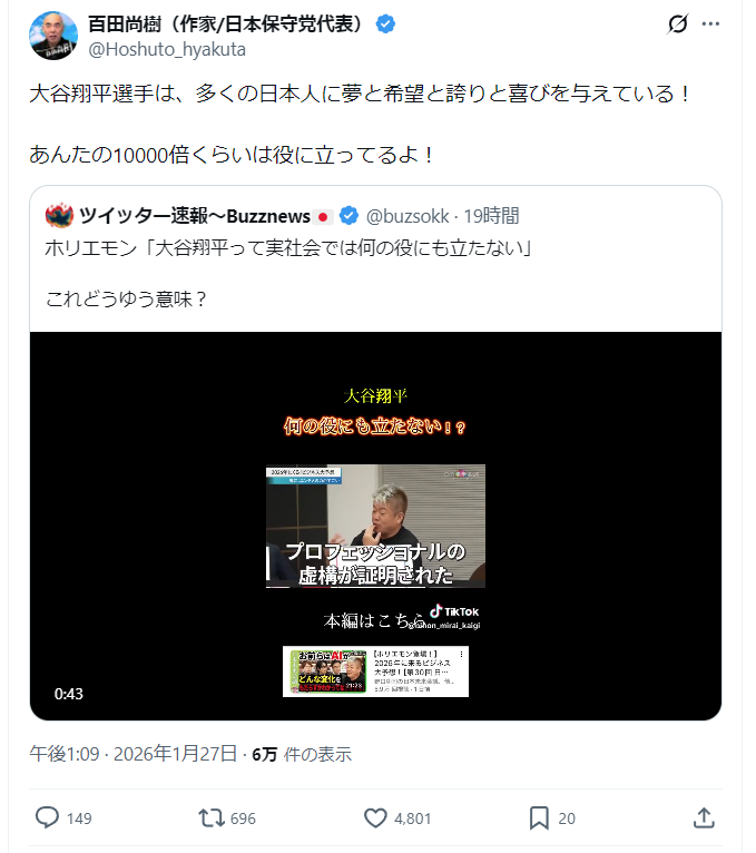 ホリエモン「大谷翔平は実社会では何も役に立たん」百田尚樹「お前の10000倍役に立ってるわ」