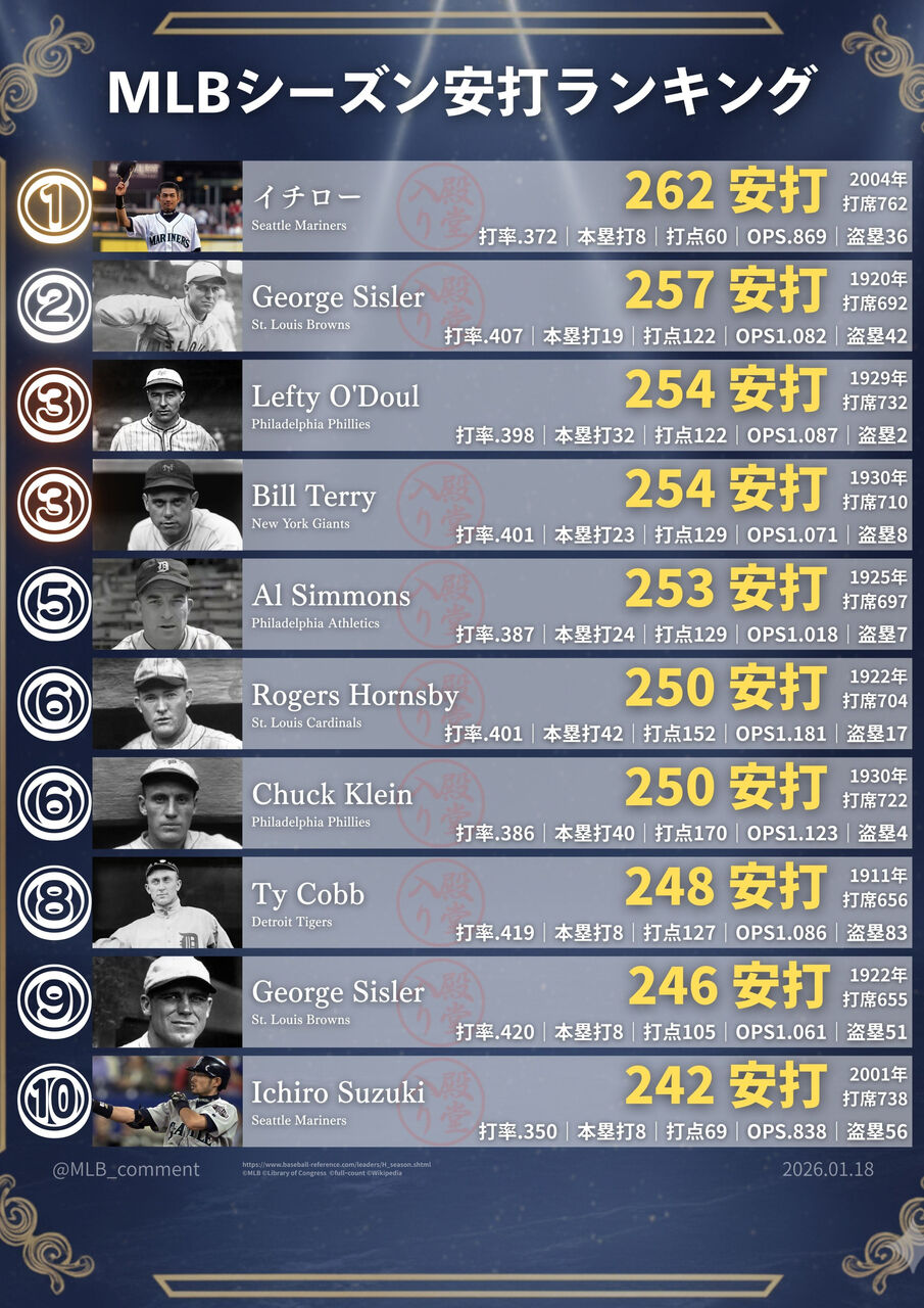 【悲報】メジャーのシーズン安打記録ベスト10、イチローのOPSだけ圧倒的にショボいwwwww
