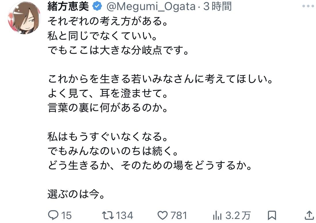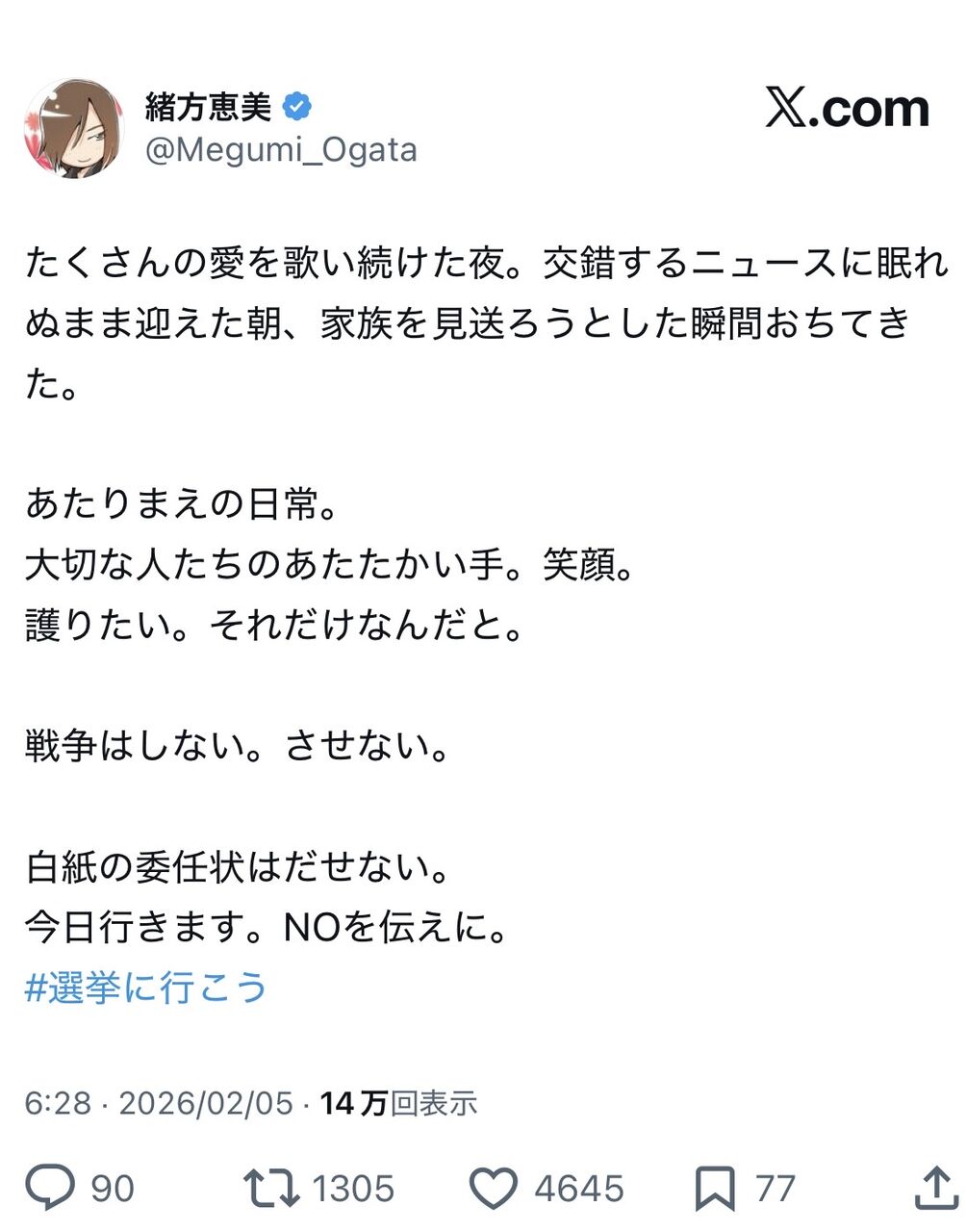 緒方恵美、覚せい!「沢山の愛を歌い続けた夜!戦争はしない!白紙委任状は出せない。NOを伝えよう」