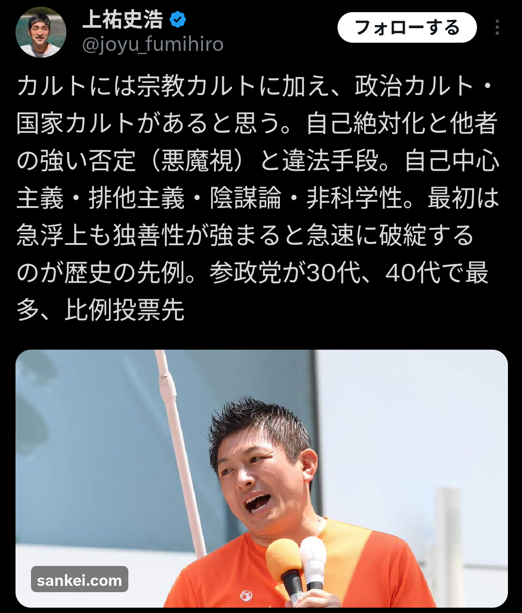 【悲報】元オウム・上祐史浩、参政党の危険性に警鐘を鳴らす
