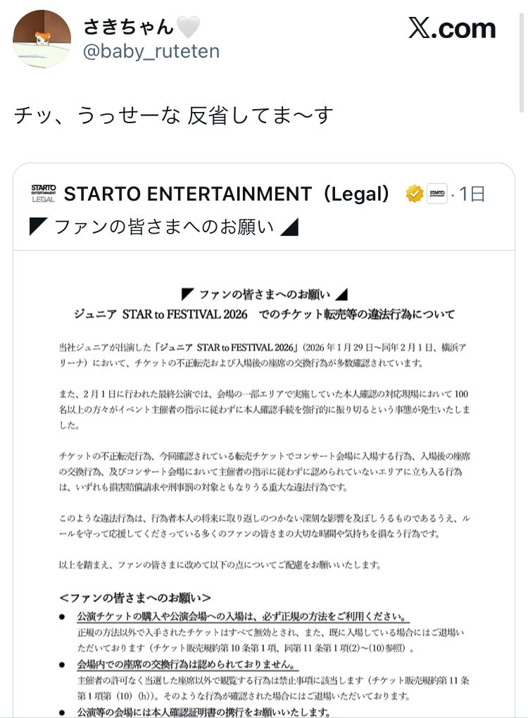 【朗報】ジャニオタさん、チケットの不正転売について大爆笑の謝罪をしてしまう