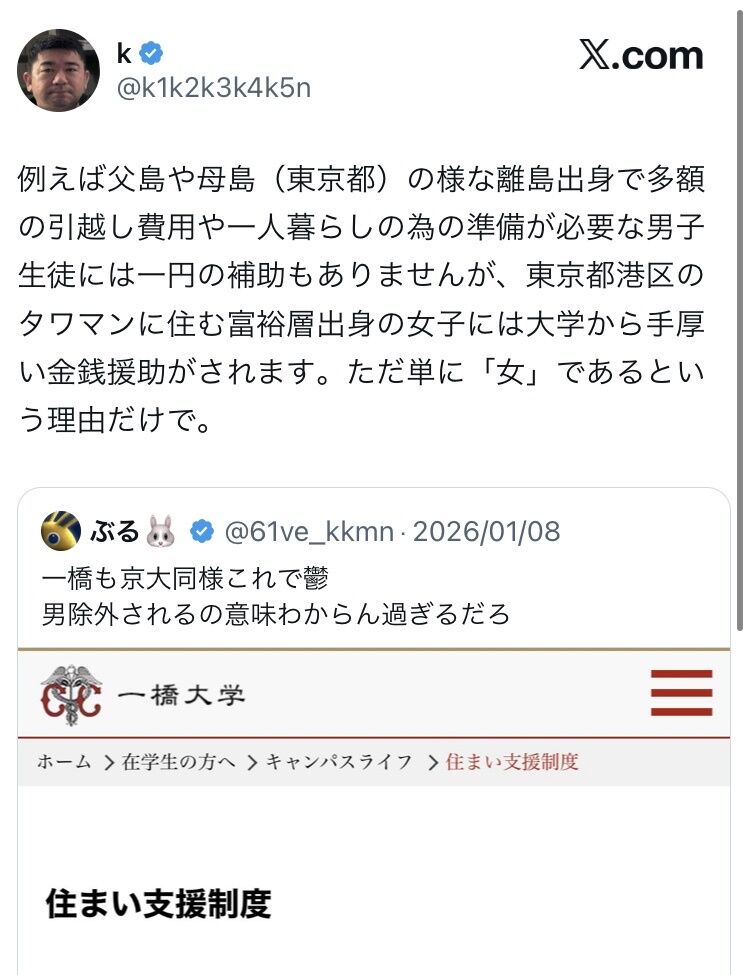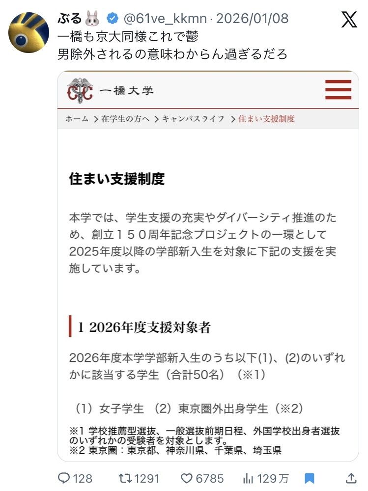 一橋大学さん、女子学生限定住まい支援制度を導入wwwwwww