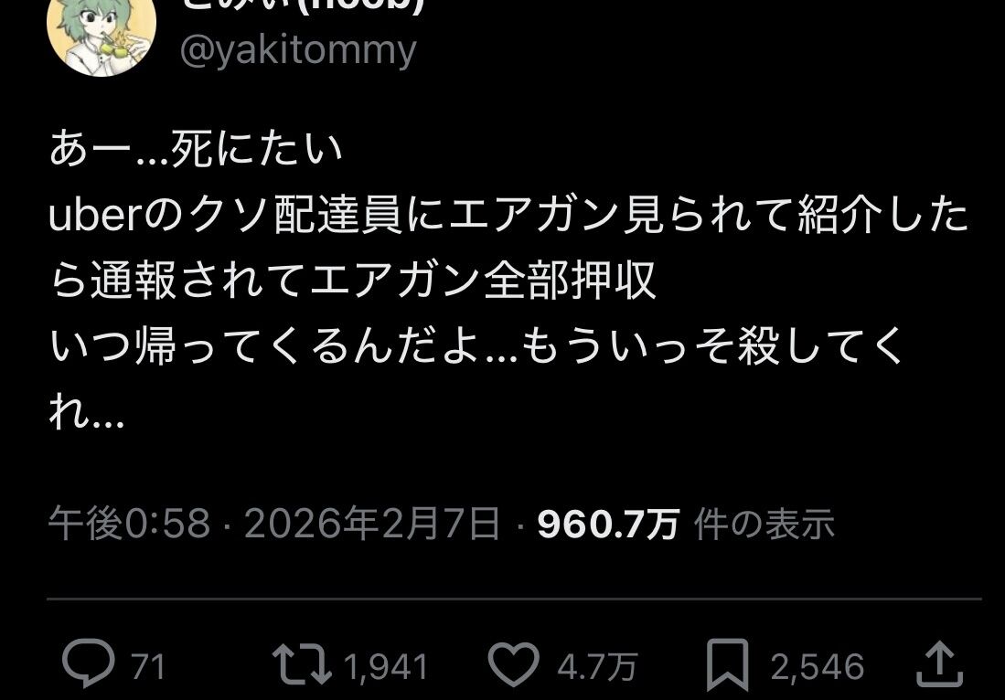Uber「Uberでーす。うわ!こいつの部屋銃まみれやんけ通報!」部屋主「エアガンやが」警察「押収する」