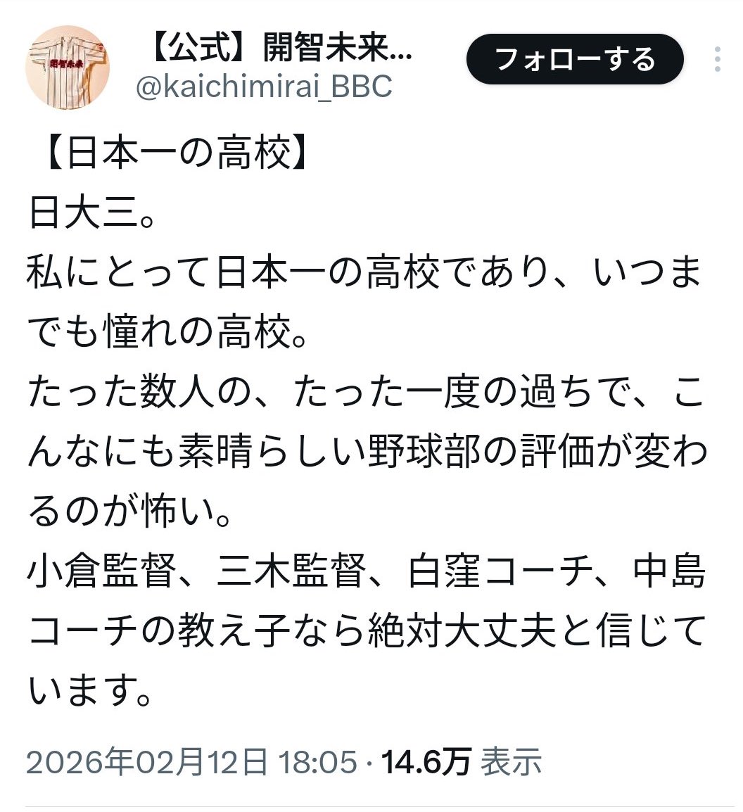 開智未来高校硬式野球部「たった一度の過ちで日大三野球部の評価がここまで変わる世の中が恐ろしい」