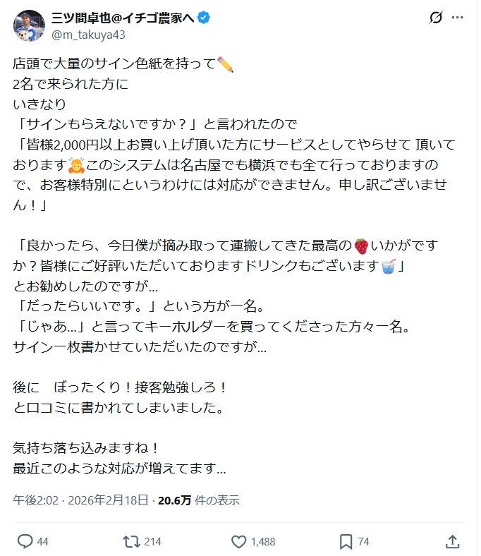 イチゴ農園を営む元プロ野球選手、サイン転売に狙われて口コミに低評価を受けてしまう