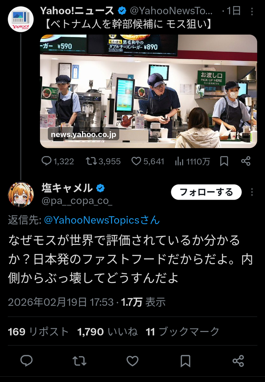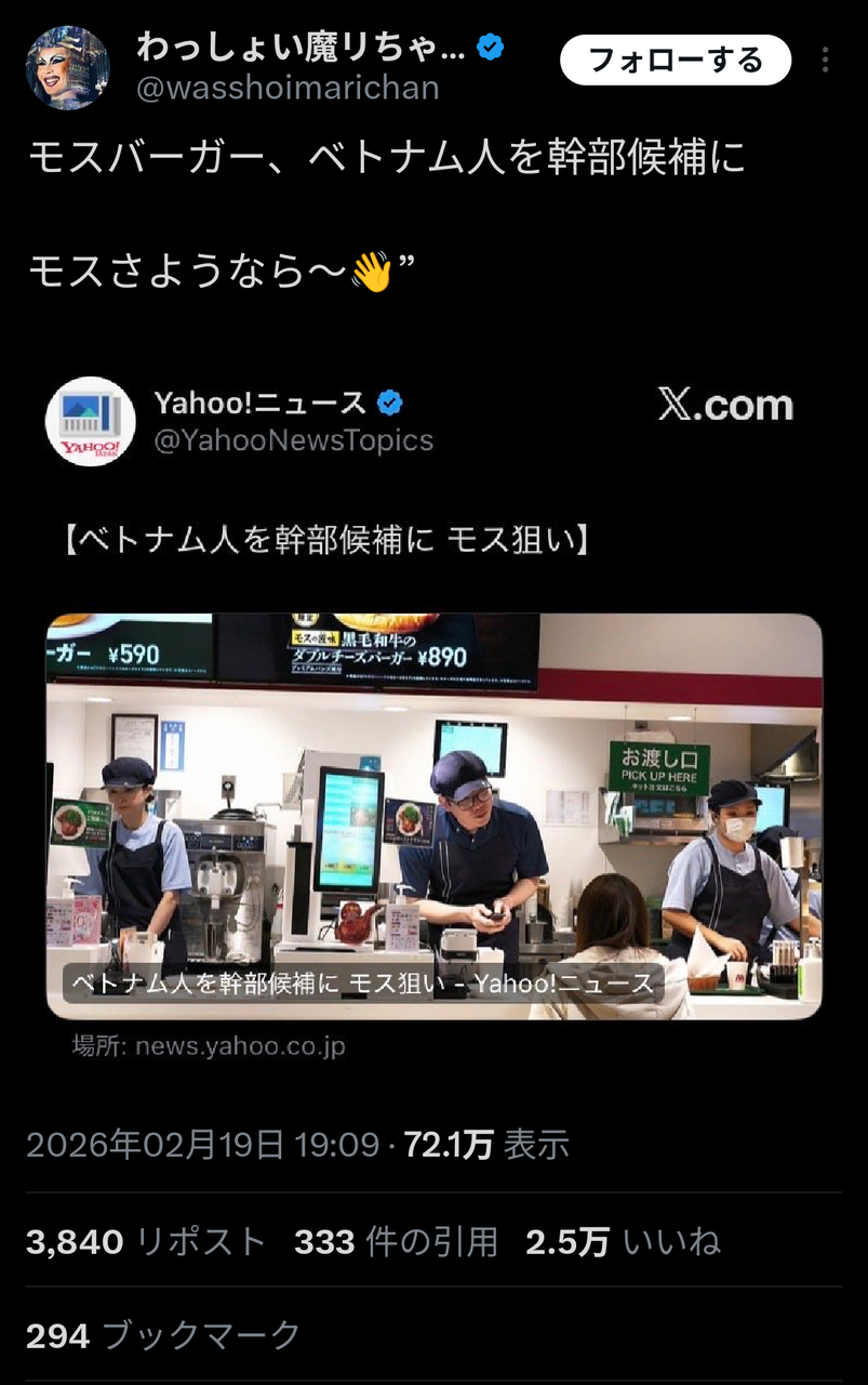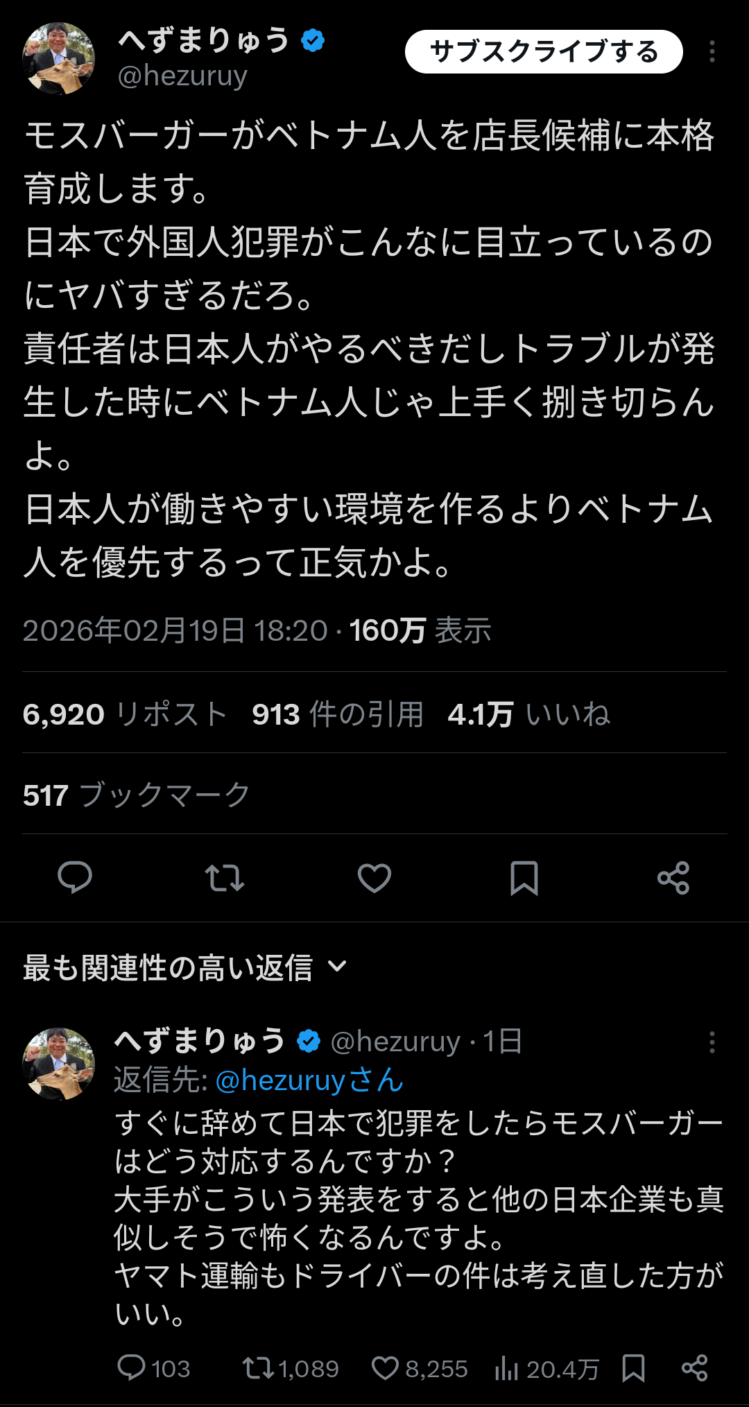 【悲報】モスバーガーさん、ベトナム人を店長にしてしまい炎上🔥大物保守活動家らも非難