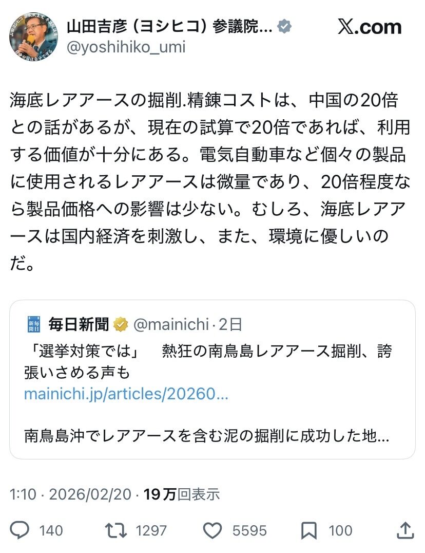 国民民主党「日本産レアアースは20倍の価格でも問題ない。むしろ経済を活性化させ環境にも優しい」