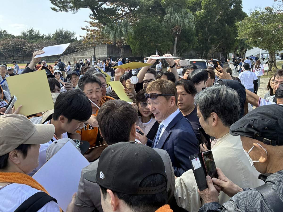 ブルペンを後にした瞬間だった。近くで練習を見ていたG党らが、姿を確認するとすぐさま「立浪さーん!」「サインくださーい!」と声を大にして〝ラブコール〟。それを聞いた同氏は他チームのファンおよそ50人に〝完全包囲〟されても、笑顔で真摯に対応し、丁寧にボールや色紙にサインを書いていた。