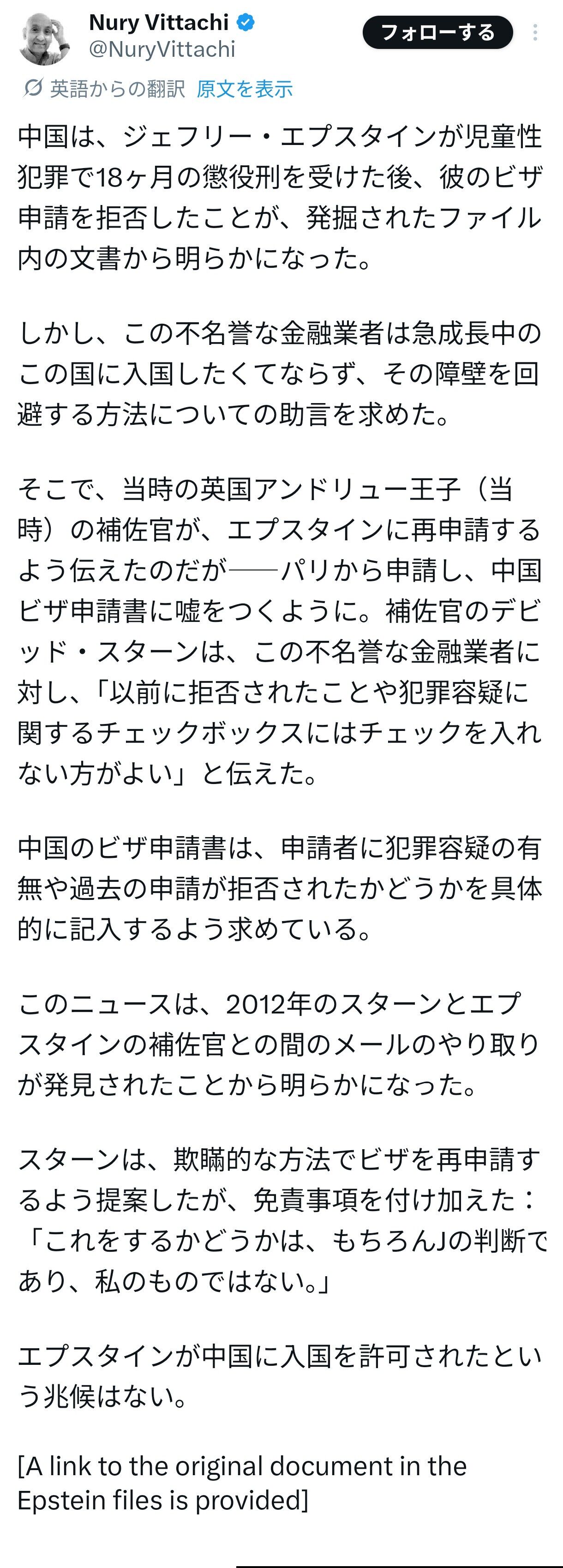 【悲報】中国父さん、エプスタインの入国を断固拒否していたwwwww