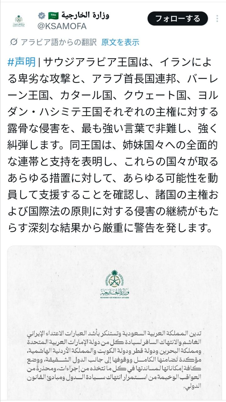 【速報】サウジ&UAE&バーレーン&カタール&クウェート&ヨルダン「イランを絶対に許さない」