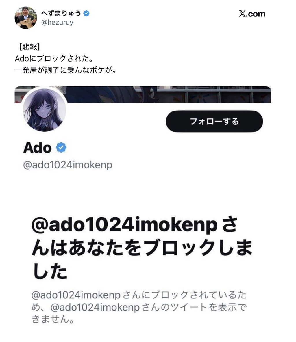 【朗報】Ado、へずまりゅうをブロック。へずまブチギレwwwwwww