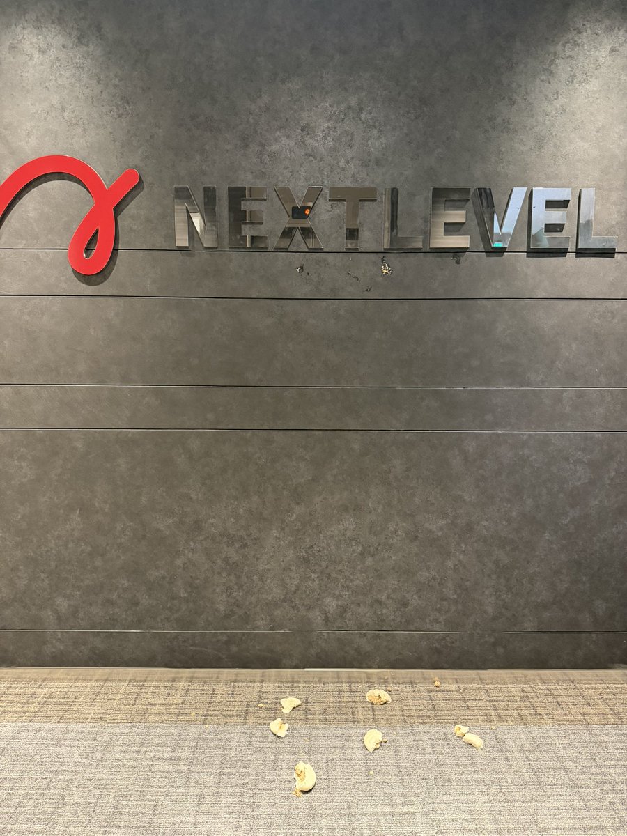 添付された動画では、河原氏が経営する会社のエントランスの壁や床に、バラバラになった豚まんが落ちている。