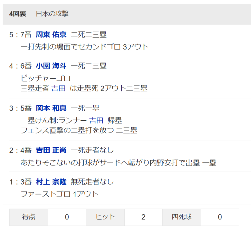 近藤アウト周東イン 岡本アウト佐藤輝明イン
