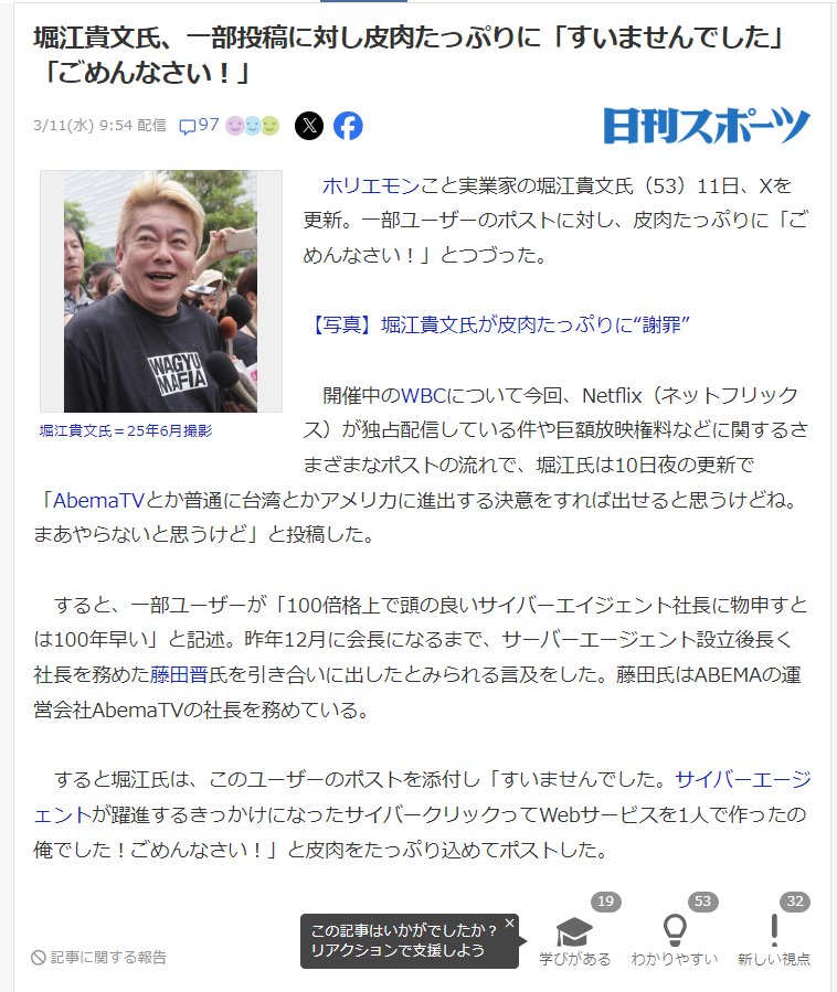 堀江貴文「サイバーエージェントが躍進する要因を作ったのは間違いなく俺」